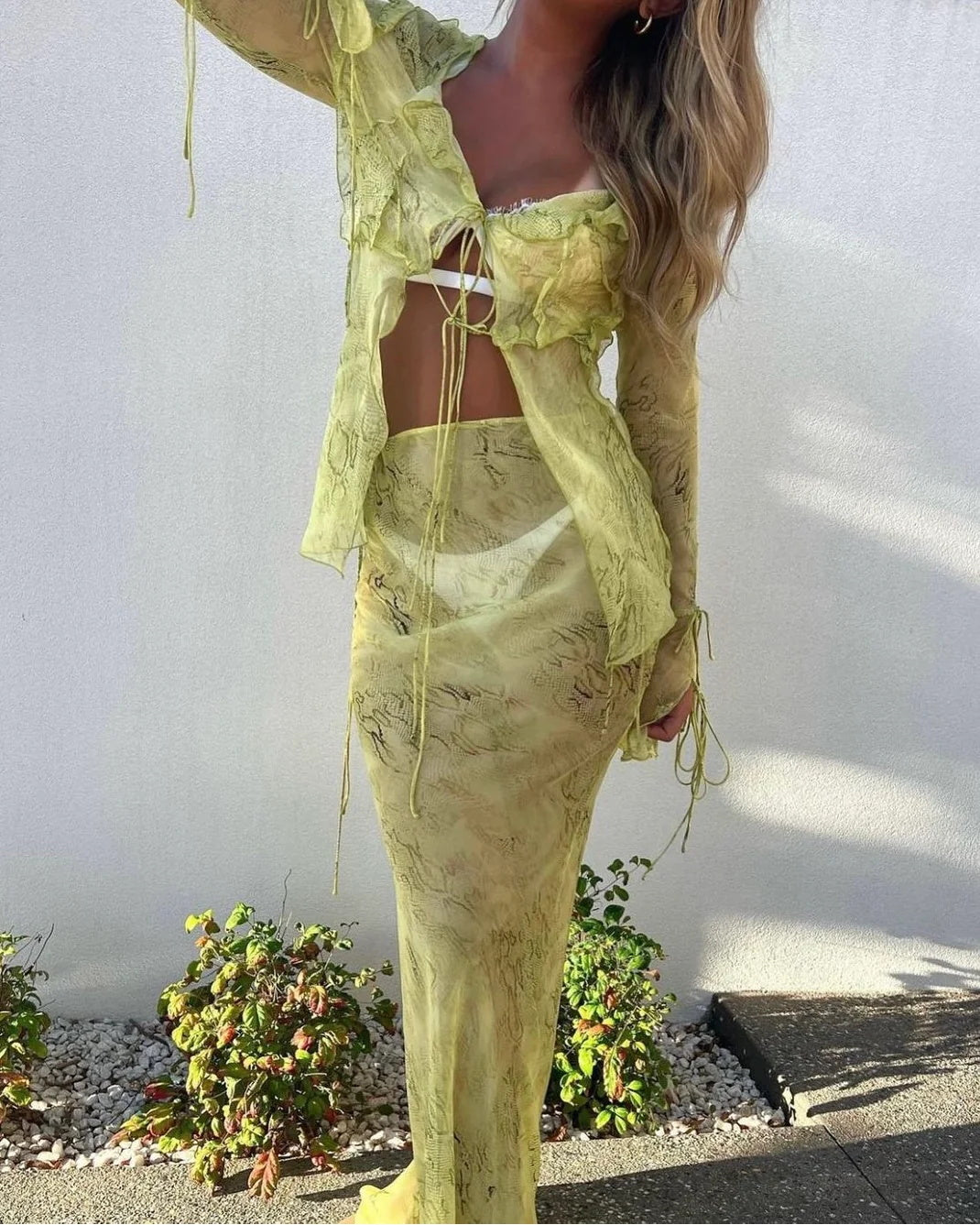 The high-waisted maxi skirt is both stylish and comfortable, flowing gracefully as you walk. Its slim fit design beautifully complements your silhouette, while the soft fabric adds a touch of femininity and grace. Whether it's a casual day out or a fancy dinner date, this versatile set is a must-have in your wardrobe.