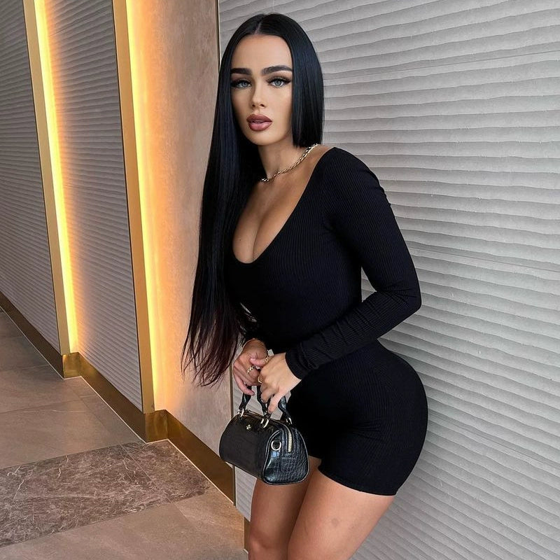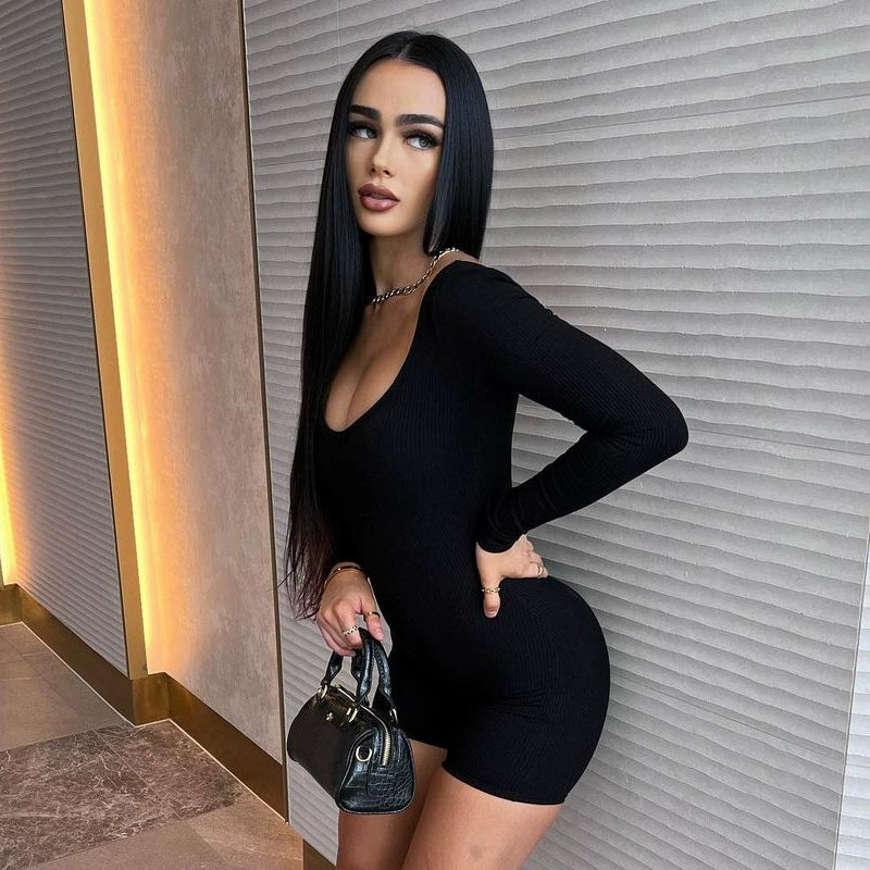 "Get ready to rock your day in style with the Kynadi Long Sleeve Romper in Black! This V-neck romper features a bodycon fit that flatters your figure while providing all-day comfort. Part of the LaPose Sportswear Collection, it's perfect for daytime activities. Say goodbye to boring outfits and hello to effortless chic!"